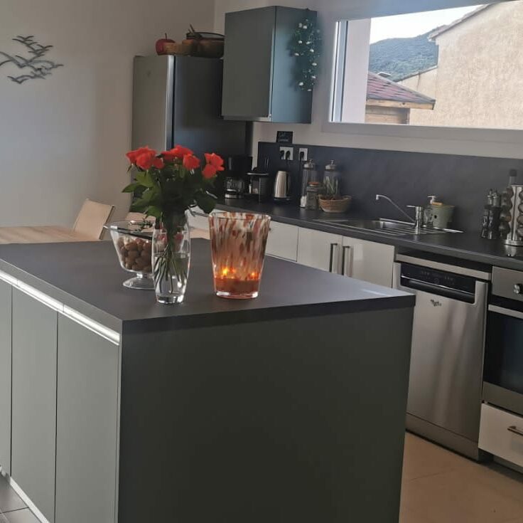 La cuisine ouverte sur le salon salle à manger est entièrement équipée.
